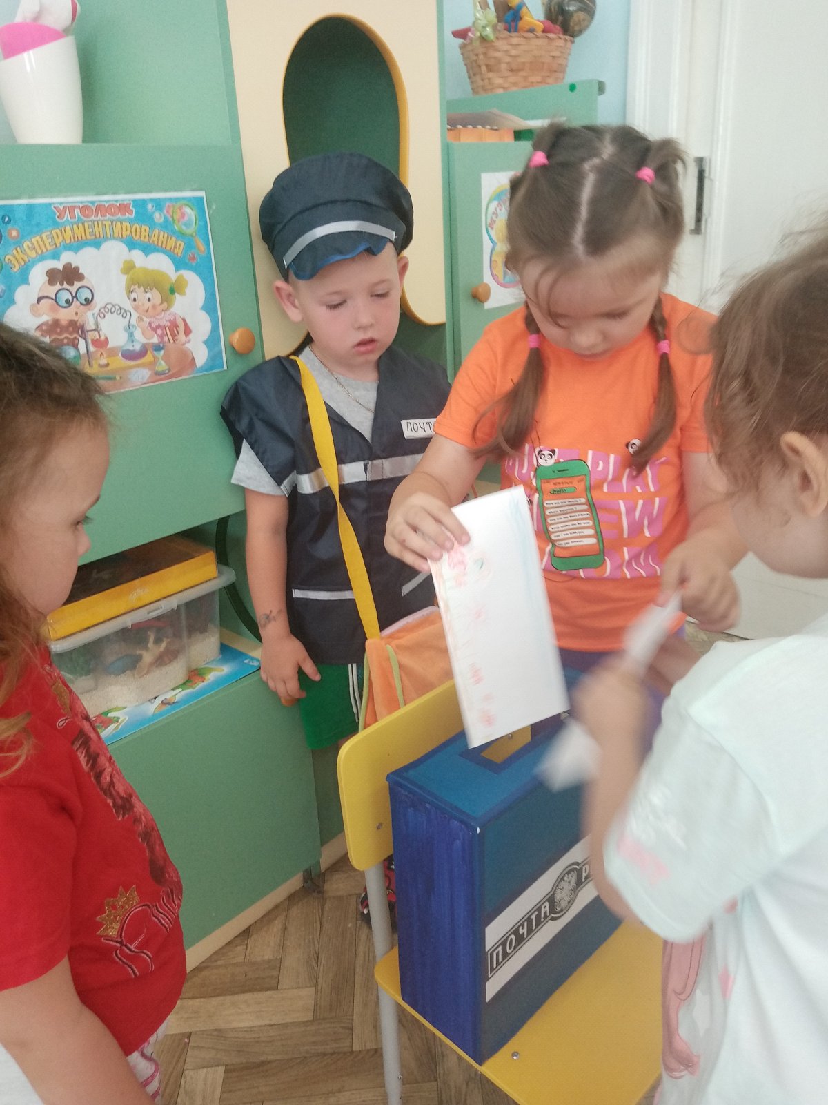 Для того чтобы побудить интерес к профессии и работе почтальона, ребята поиграли в сюжетно-ролевую игру «Почта». В процессе игры дети писали письма, запечатывали их в конверты и опускали в почтовый ящик, собирали и отправляли посылки для друзей, а главный герой игры- почтальон, принимал и доставлял все это адресатам. Так, в игровой обстановке, дети дружно и увлекательно провели время, узнали много нового и интересного о работниках почтовой связи.