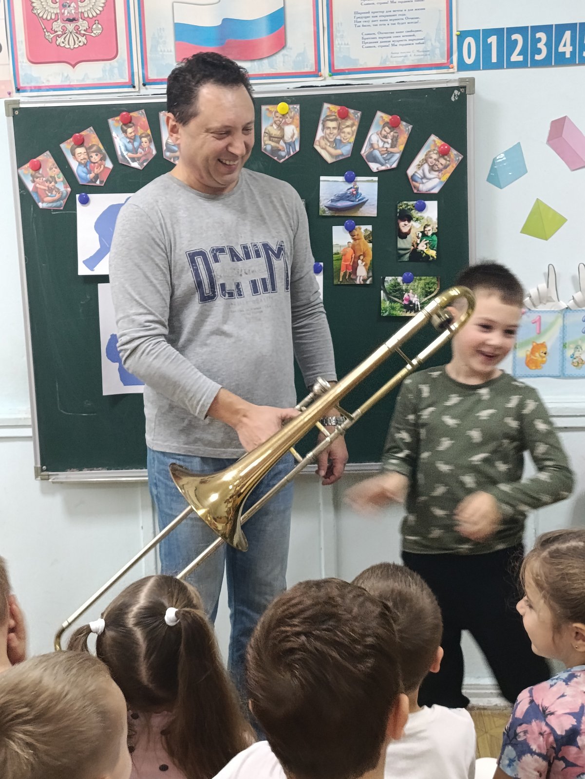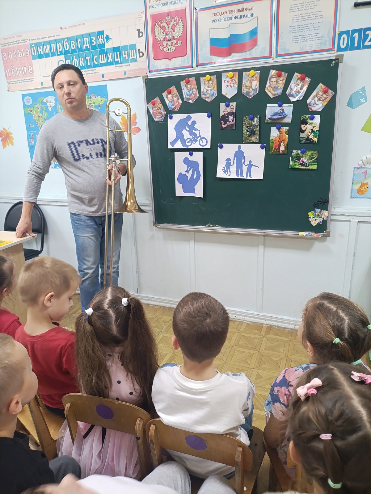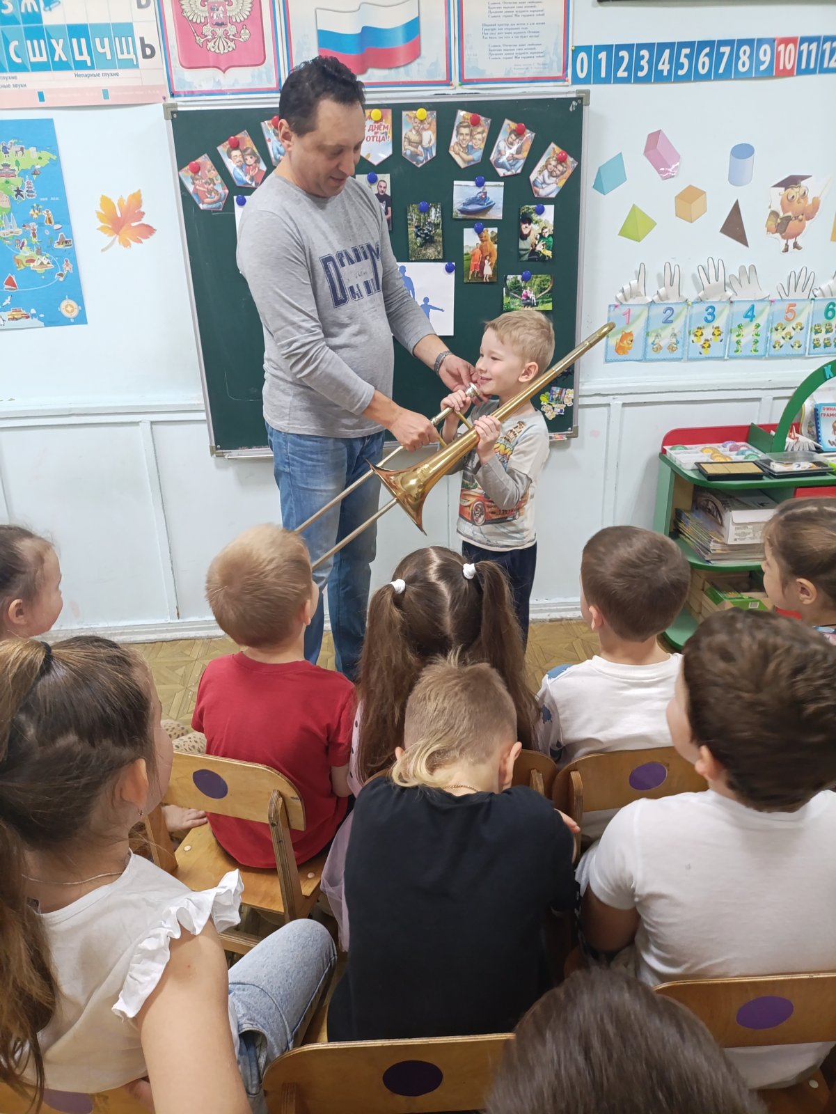 В группе "Фантазёры", педагог Ботнарь Н.В., начался образовательный проект посвящённый Дню отца. В рамках проектной деятельности для ребят Андрей Иванович Демкив, папа Анастасии, организовал мастер-класс игры на трамбоне. Дошколята впервые познакомились с таким духовым инструментом, послушали его звучание. Восторг и море положительных эмоций вызвал приход такого творческого папы в группу.