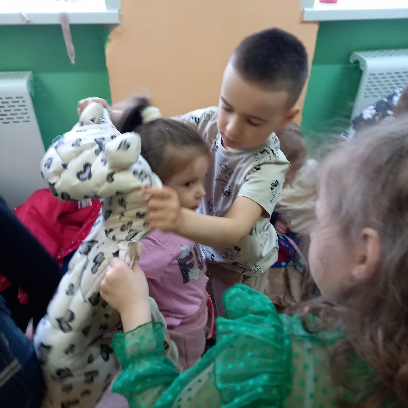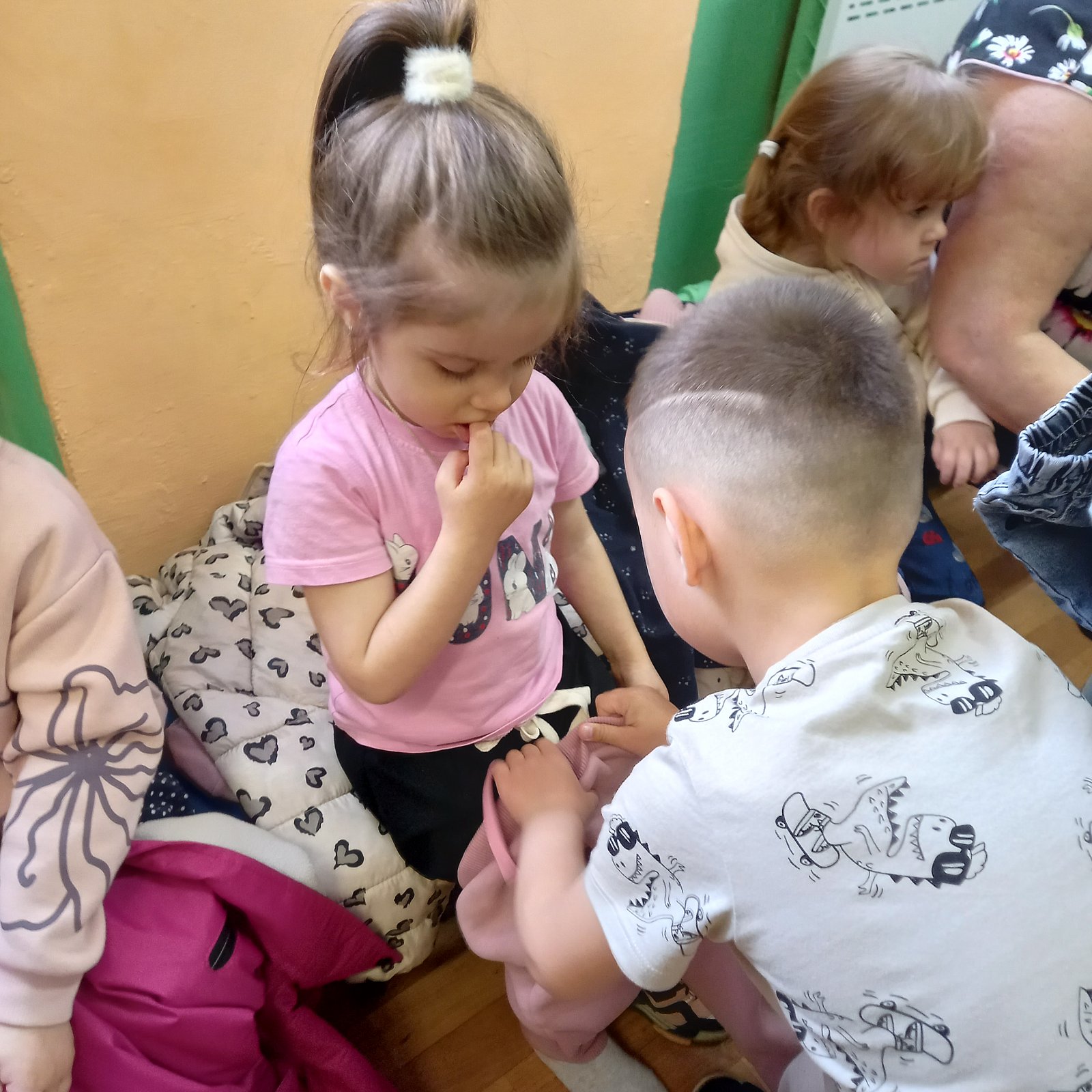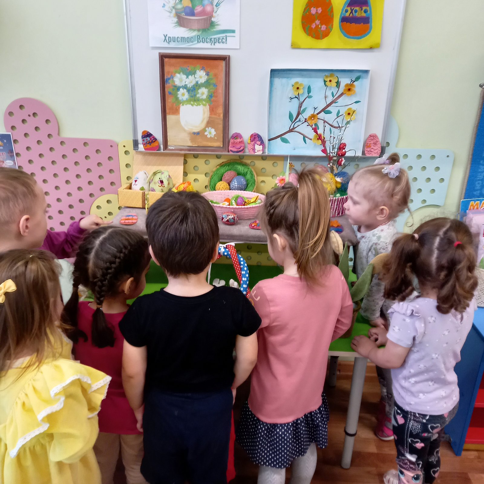 В группе "Сказка", педагог Кузнецова Н.А., ребята организовали добрую экскурсию для малышей группы "Ромашка" по выставке "Пасхальные мотивы", где рассказали и показали свои работы. Юные доброхоты продолжили свою деятельность с малышами и помогли им одеться на прогулку, делая это спокойно и ответственно.